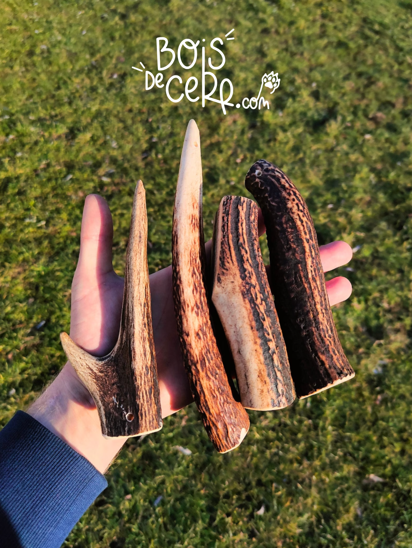 🐶 Bois de cerf de plusieurs tailles / poids disponibles : de 35 à 600g et plus.